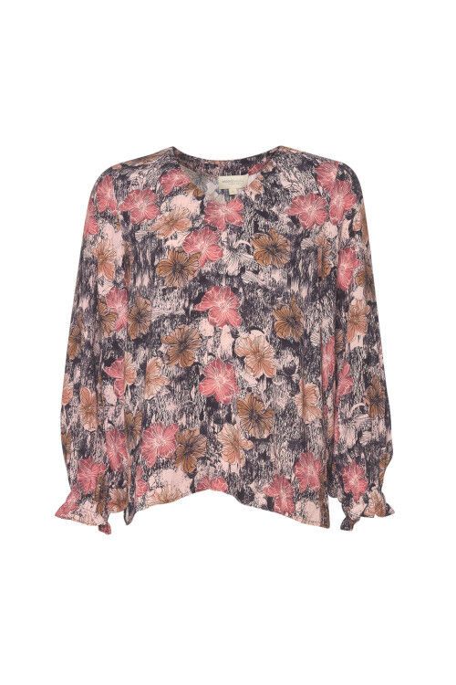 Printed viscose rayon twill gathered V-neckline blouse with blouson sleeves and elasticated ruffle cuff. Viscose rayon twill - 50% viscose, 50% rayon