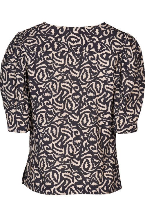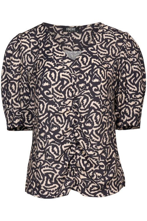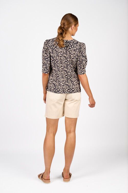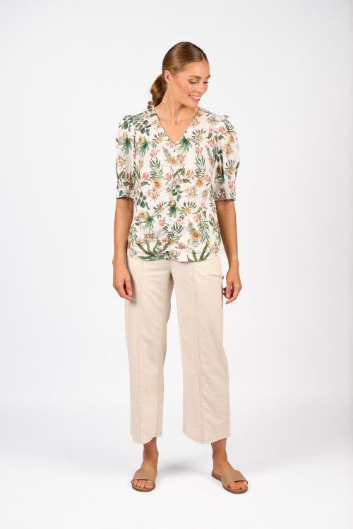 The Fizz Top features a flattering V-neckline and a gathered centre front seam for subtle texture. Puff sleeves with gathered shoulders and pleated cuffs add a feminine touch, while side seam splits and a relaxed fit keep it comfortable and easy to wear.