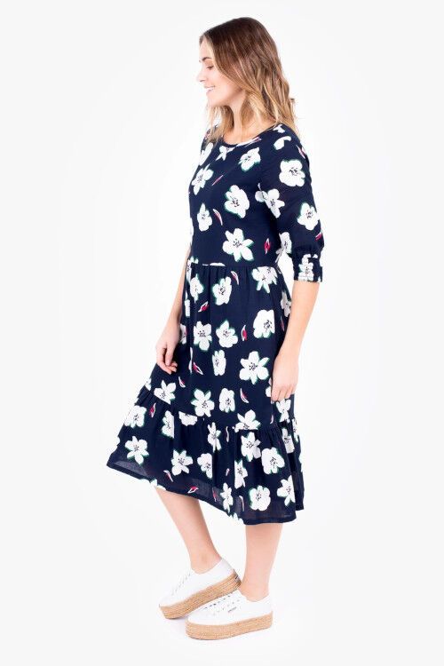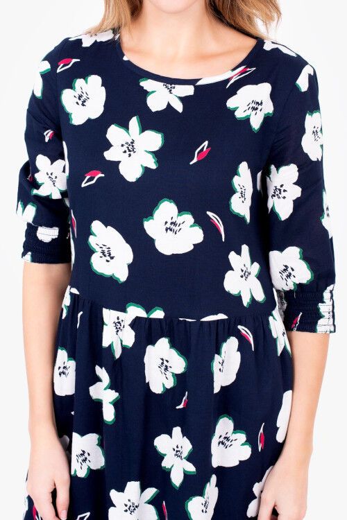Welcome in the warmer weather wearing this cool cotton, floral print, midi-length dress. With its gently gathered waist, elasticated cuffs on 3/4 sleeves, and round neckline, it offers a customised fit for your ultimate comfort. And yes, it has functional pockets! Outer: 100% cotton; Lining: 100% cotton