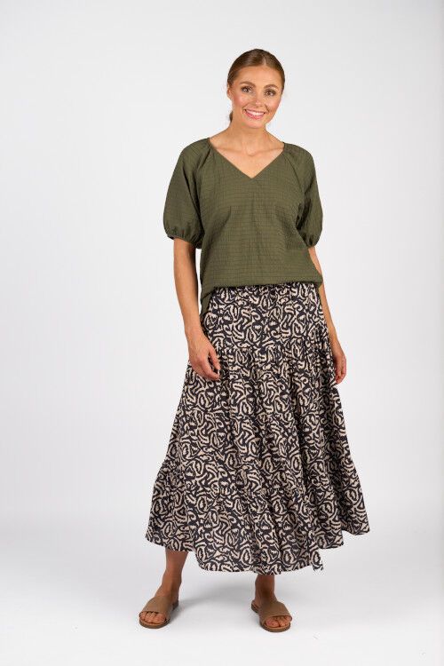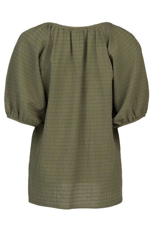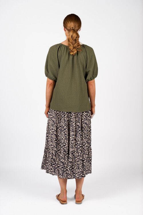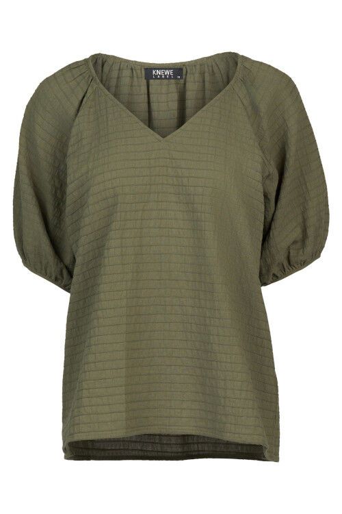 The Focus Top in olive is a floaty, relaxed summer essential made from lightweight cotton with a subtle horizontal seam texture. It features a flattering V-neck, short raglan puff sleeves, and a hem that dips lower at the back for effortless, breezy style.  100% cotton
