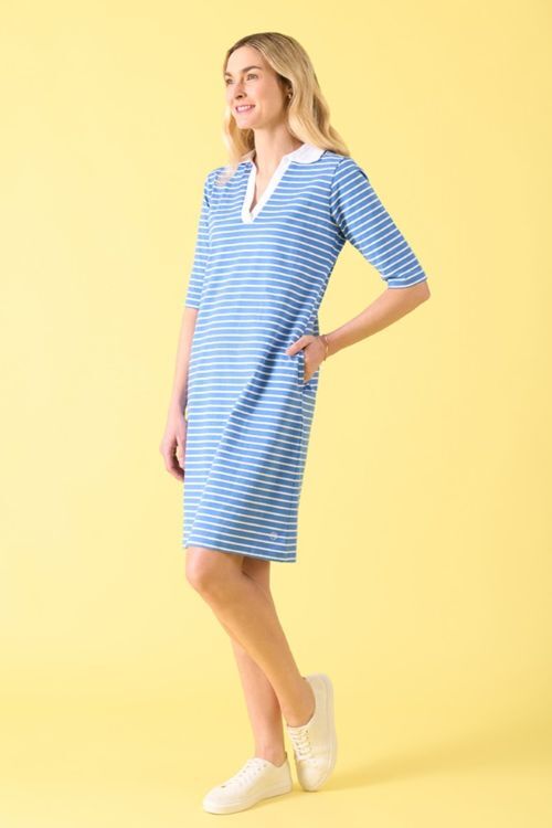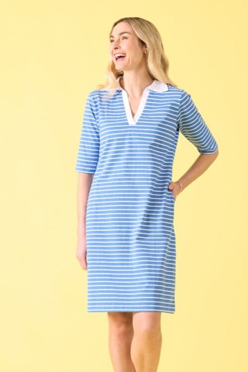 A cotton dress with a collar, V placket neckline and a half sleeve - we get asked for this so often! This really is a go-anywhere everyday dress, and it comes in lovely summer colours. 100% cotton single jersey