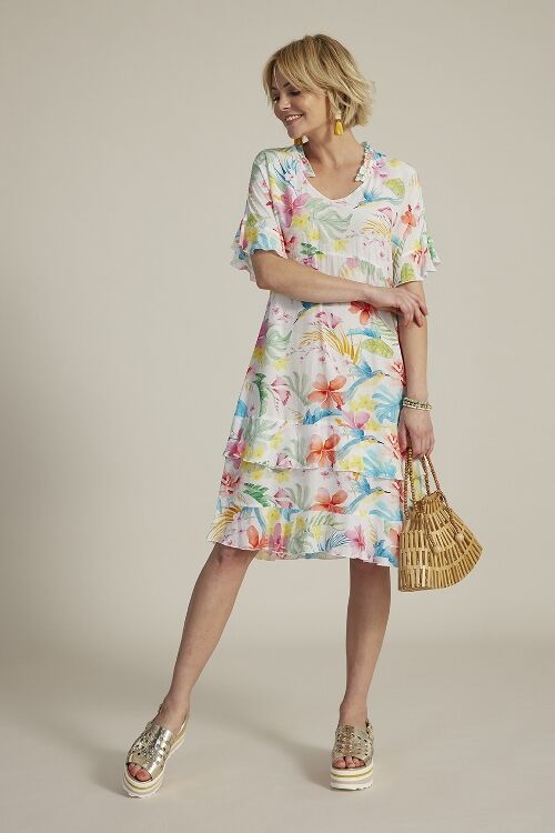 Floaty knee-length dress in fun tropical print. Featuring layered ruffle tiers and delicate ruffle neckline detail. 30% viscose, 70% rayon