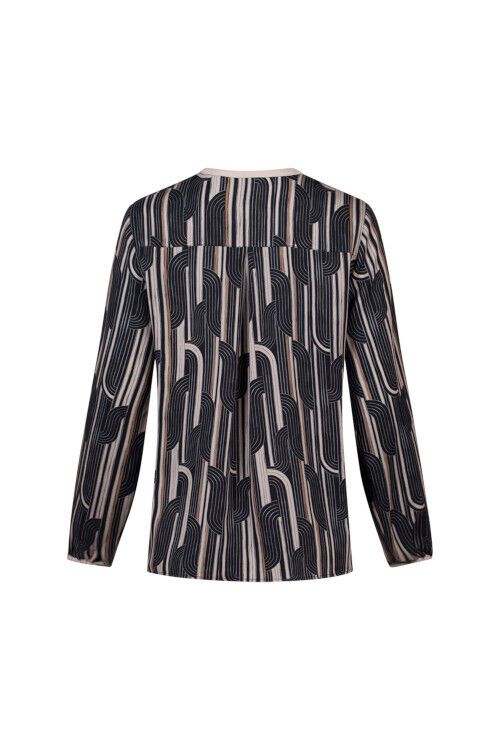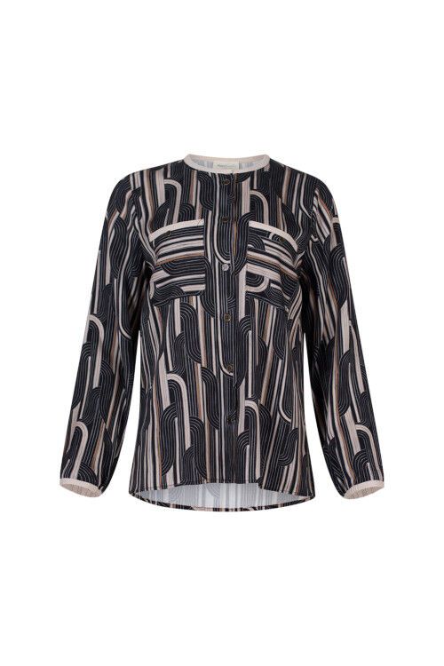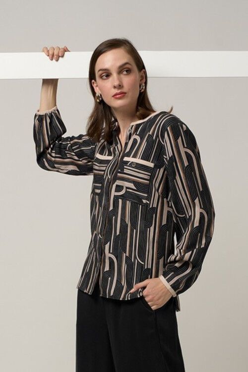 Printed top with thin contrast collar and cuff, with metal buttons. Contrast direction pockets with contrast binding. 100% tencel