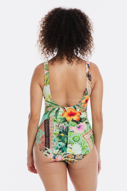 A one piece swimsuit with a square neckline and vertical lines of ruching which offers a flattering fit. Featuring elastic under bust support, power mesh tummy control and full lining. 82% Nylon, 18% Spandex