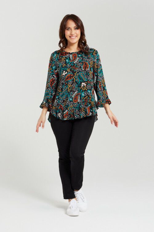 Uncover chic style with this 3/4 sleeve top, boasting frilled cuffs, a scoop hemline, and a longer back. 100% rayon