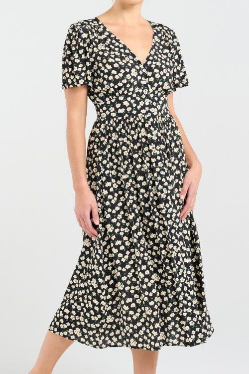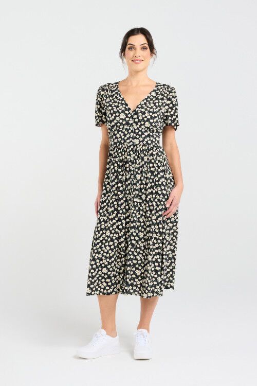 Discover the Gigi V-neck Button Front Dress from Blackstone, a timeless piece tailored for elegance and comfort. Crafted from viscose, this dress offers a soft, silky feel against the skin, ensuring all-day comfort with a hint of luxury. The classic V-neckline paired with a button front detail adds a touch of sophistication, while the shirred back waistband creates a flattering silhouette, making it perfect for both day-to-night events. Wear paired with sandals for a casual gathering or with heels for a formal occasion, the Gigi Dress adapts effortlessly to your style requirements.