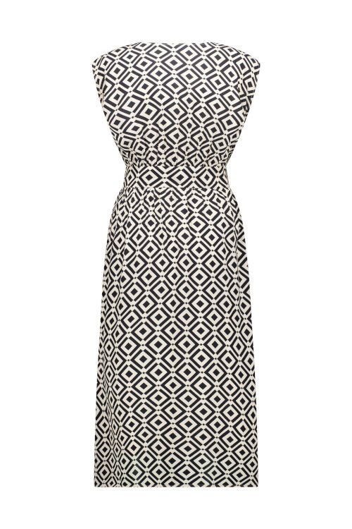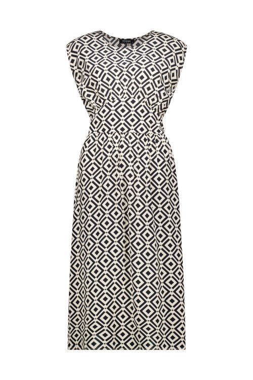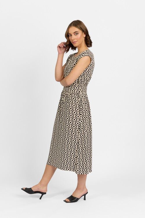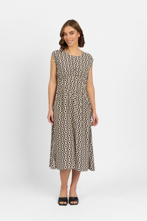 Midi length dress with round neckline, drop shoulder and fit and flare style. Relaxed fit.  61% rayon, 39% viscose