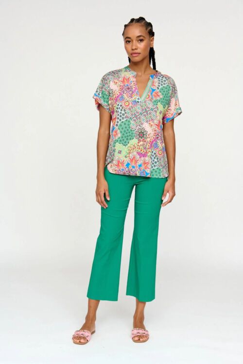 Printed straight cut t-shirt style blouse. Stretch knit fabric with a slight wrinkled effect. Round neck with V-neckline and decorative ribbon detail. Wide short sleeves with cuffs. Fold in back. Straight hem. Designed and manufactured in Spain. 99% polyester, 1% elastane