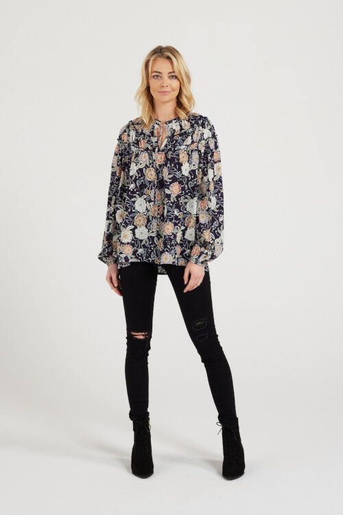 Long sleeve top with gathered seams on the yoke and split neckline with ties and floral print. 50% viscose, 50% rayon