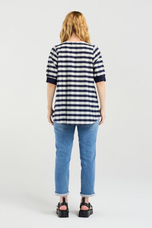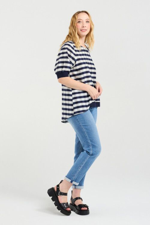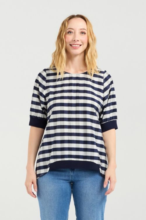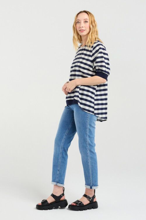 Zafina's stylish basic reimagined in the seasonal colours and prints. Features elbow length sleeves, rib cuffs and a ribbed hem. The front hem rests at waist length, while the back hem is rounded and falls below the hips, creating a chic and flattering look. 100% cotton