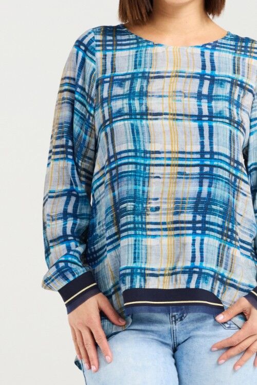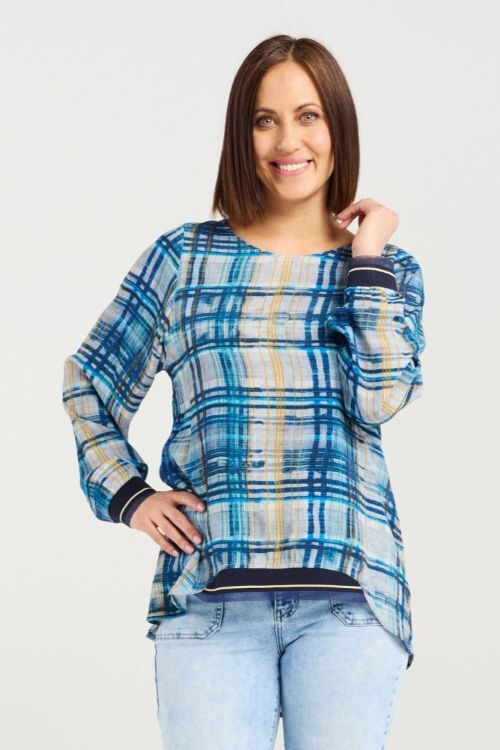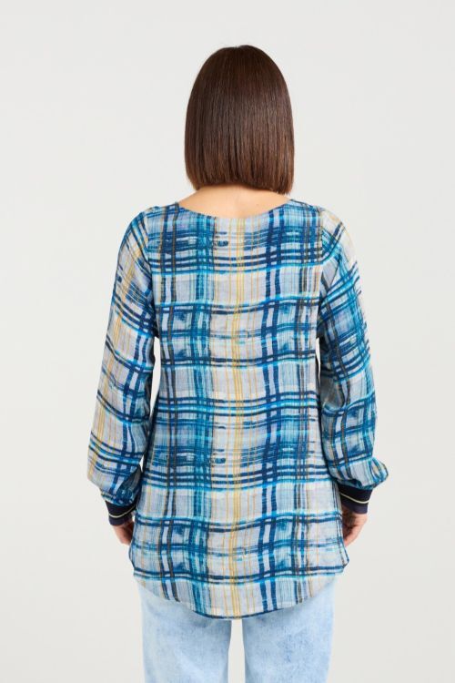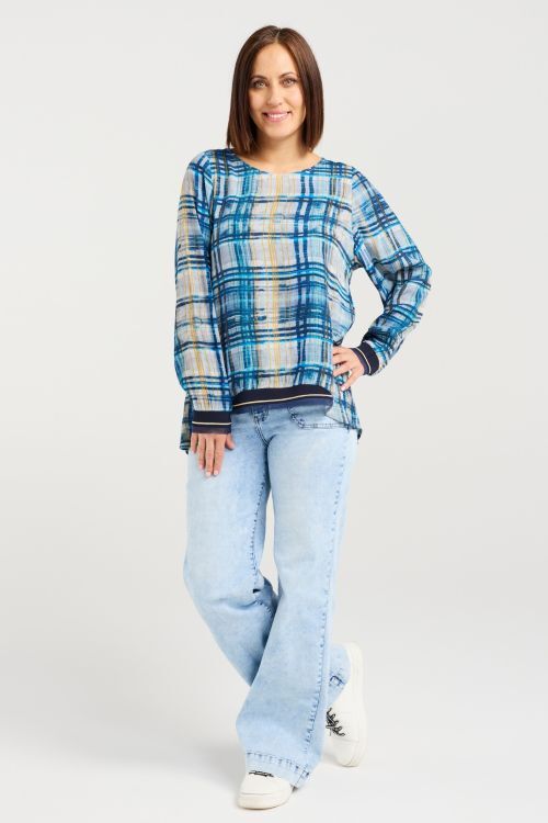 Zafina's all-time classic long sleeve top gets a fresh update in a cool, modern ocean plaid. Designed with ribbed, elasticated cuffs and a front hem for comfort and shape, it’s finished with a round neckline for an easy, timeless look. 50% viscose, 50% rayon