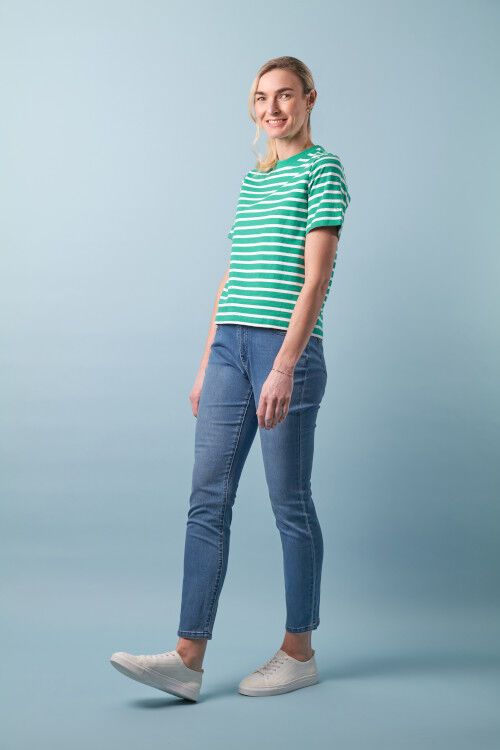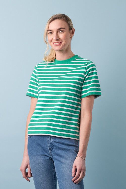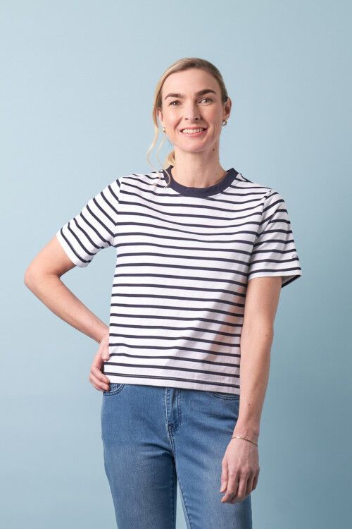 A classic boxy tee with striped fabric and a solid rib neck detail.