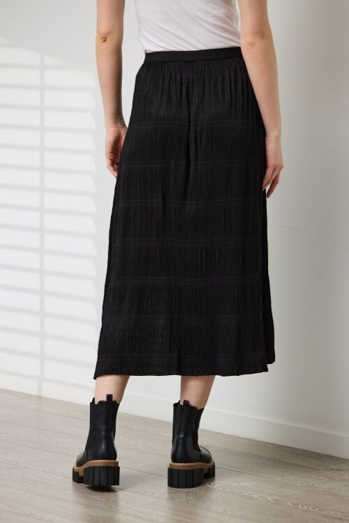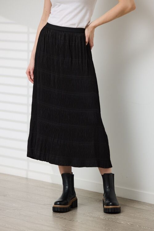 This black skirt is crafted from a gentle and lightweight fabric, ensuring a comfortable fit. It features a fully elasticated waistband for easy wear and a permanent pleated design that adds a touch of elegance. With its long line length, this skirt is perfect for any occasion. 100% polyester