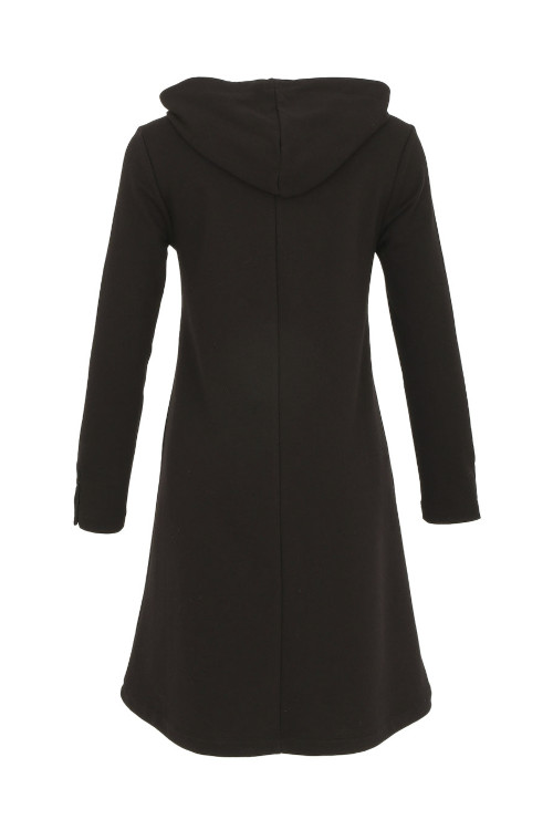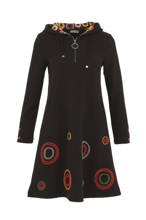A very stylish yet casual winter dress to pair with boots, featuring a "Moving Target Pilot" Simply Art design by the artist Jane Davies. A-line shape with feature half-zip and dawstring hood with print fabric on the inner. The textured circular motifs are on the front only (plain back and sleeves). The full length sleeves have feature red buttons and there are front pockets for convenence. 65% cotton, 35% polyester
