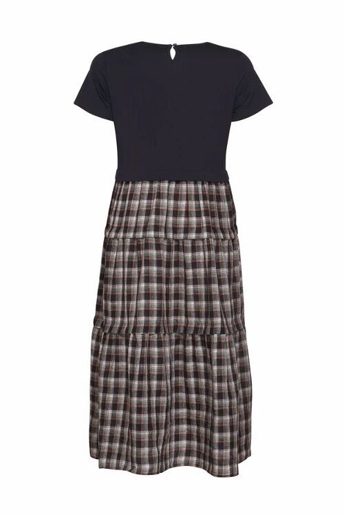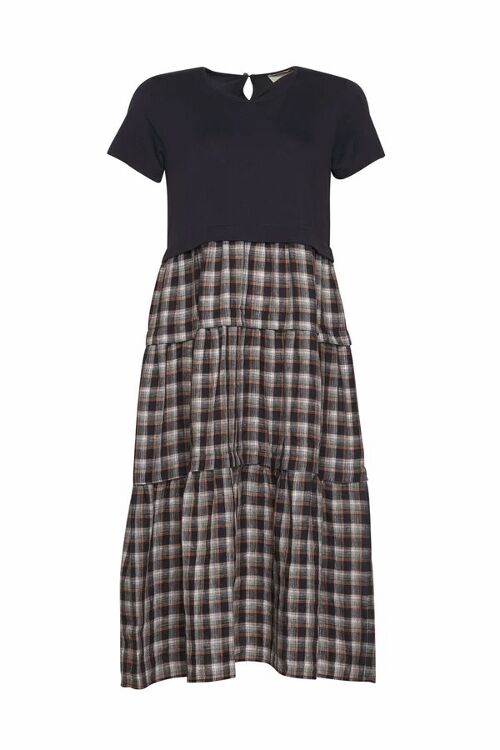 Mixed media style midi dress with t-shirt bodice in knit jersey flowing into tucked tiered plaid skirt. Knit: 47% modal, 47% cotton, 6% spandex; Woven: 100% linen