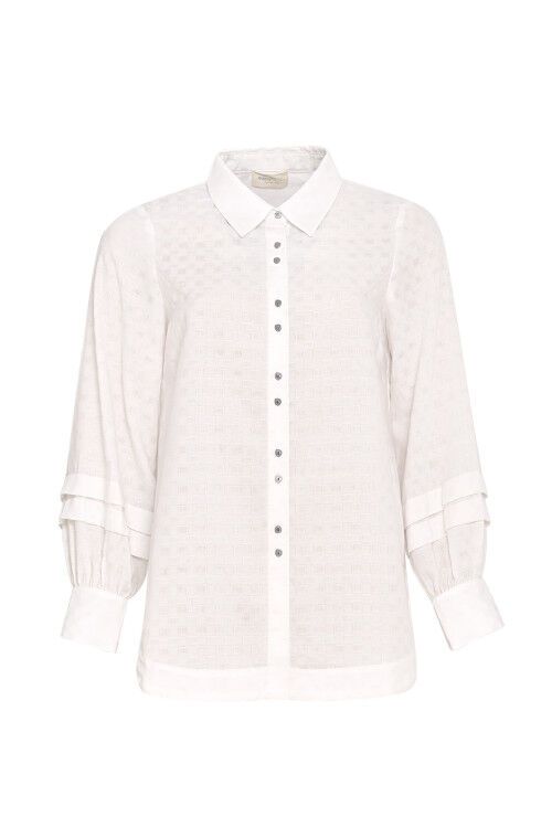 Longline check jacquard collared shirt with tuck detailing on lower sleeve and back yoke. Featuring paired asymmetrical buttons on front placket. Rayon polyester check jacquard - 80% polyester, 20% rayon