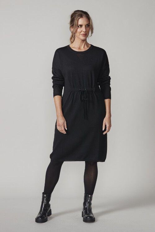 A scoop neck merino dress with long sleeves and elasticated waist panels. Front waist has a tie to cinch tighter or looser. The front neckline and sleeves also feature a delicate knit construction for a sheer "V" panel. 100% merino wool