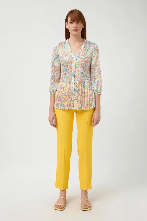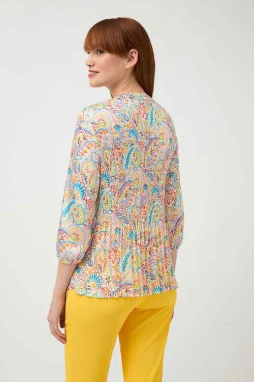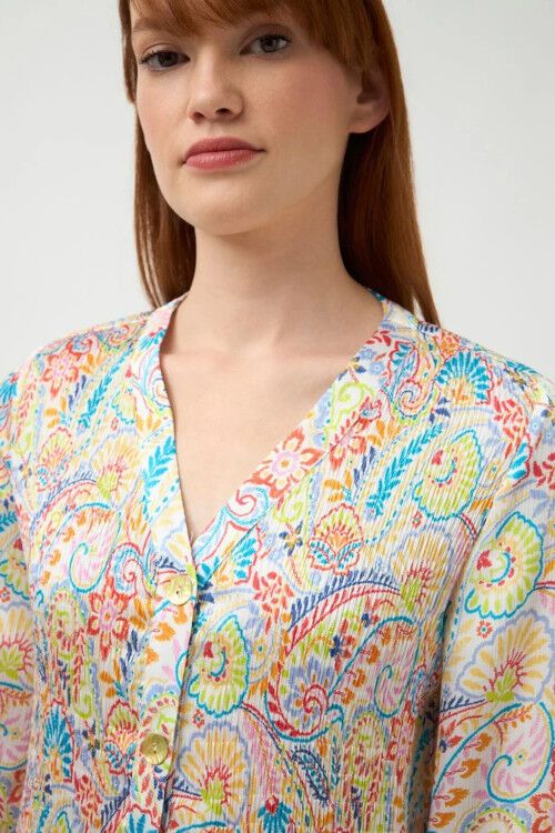 Lightweight and easy care V top in a fine pleat paisley print fabric. The front closure features mother of pearl buttons. 3/4 sleeves with elastic cuff. Designed and manufactured in Spain. 100% polyester