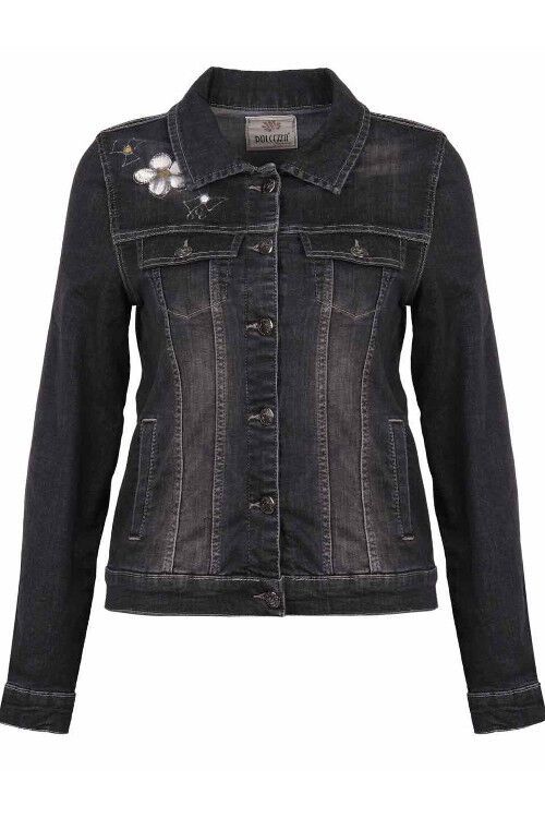 Simply Art by Dolcezza Jacket “I am Taking You Home Tonight” – lovely denim jacket in washed black featuring floral design of Vigo (from Quebec, Canada) painting, shiney embellishments on the daisy design, button closure, four pockets, stretchy. Cotton polyester elastane
