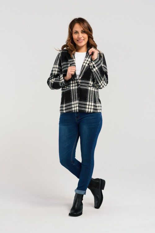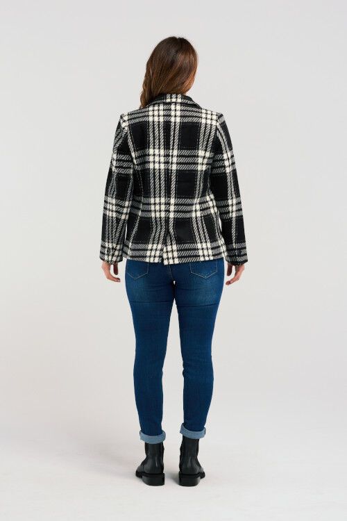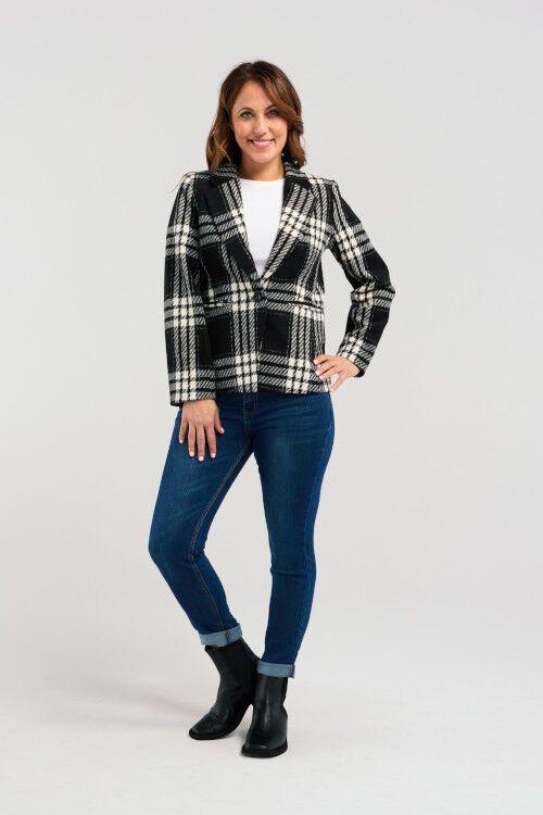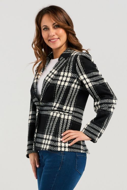 A modern take on the classic blazer, crafted from soft black-and-white plaid fabric. Designed with a flattering silhouette, it effortlessly combines timeless style with contemporary charm. 90% polyester, 10%wool