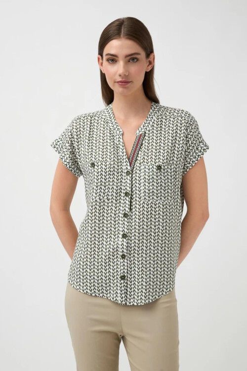 Relaxed fit short sleeve button through top with mandarin collar and V neckline. Printed ribbon detail and front pockets with button closure. Rounded hem. Designed and manufactured in Spain. 100% viscose
