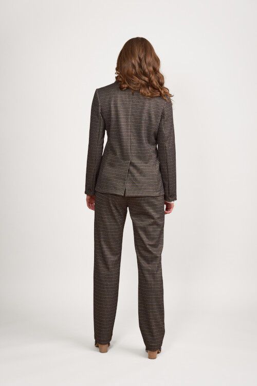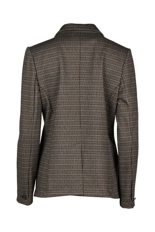 Shaped knit blazer with lapel collar and three button closure. Two welt front pockets. Long sleeves with button cuff detail. Semi taliored shaped fit with centre back vent. Unlined. 22% rayon, 74% polyester, 4% elastane