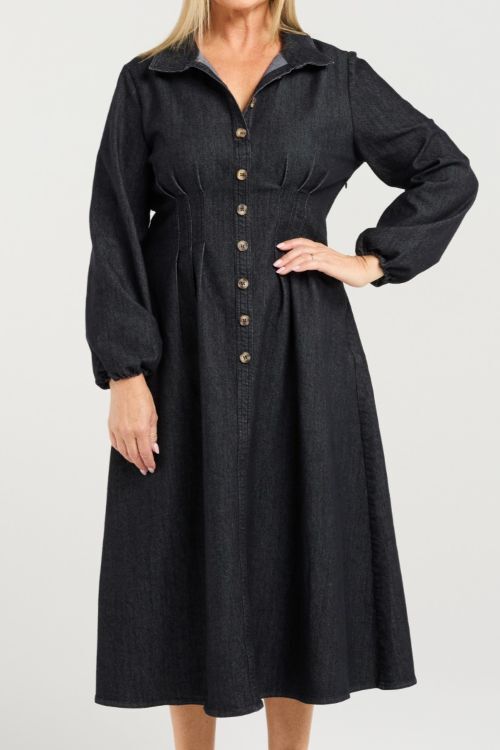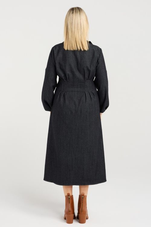 This winter dress features graceful bishop sleeves and a button-up bodice finished with a refined collared neckline. Soft pleating at the bust enhances the silhouette, creating an effortlessly elegant fit. Warm yet lightweight, it’s a timeless piece for polished cold-weather style. 65% cotton, 33% polyester, 2% spandex