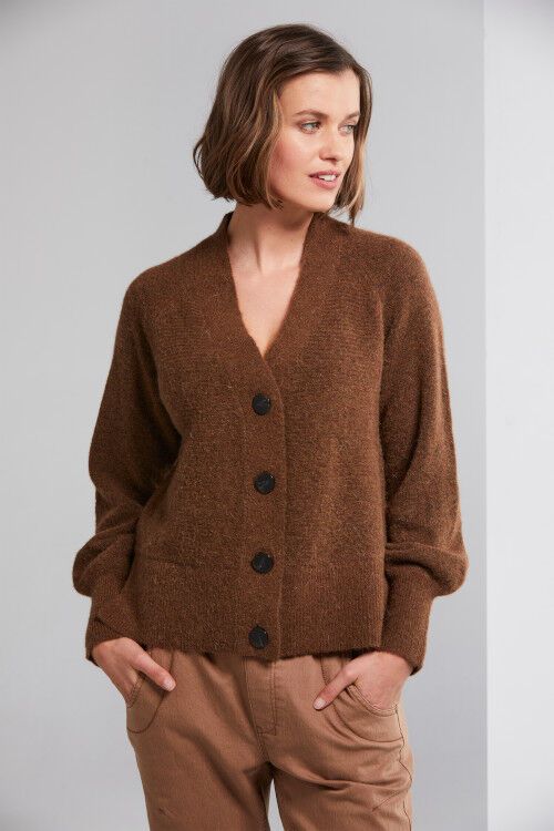 Elevate your wardrobe with the Lavinia Cardi, a stylish and relaxed-fit cardigan. The V neckline and buttoned closure make it easy to slip on and off. Crafted from a plush wool mohair blend, this cardi offers unmatched comfort. Its cropped length is perfect for layering over dresses or adding a touch of sophistication to your favourite pants. Adorned with dark tortoiseshell buttons, it's a timeless piece that complements any outfit. 49% nylon, 35% wool, 13% mohair, 3% elastane