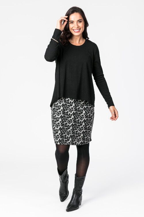 A great little dress that can be worn with leggings or tights, an excellent addition to your winter wardrobe. The dress has an outer layer in plain black with the inner layer animal print. 94% Polyester, 6% Elastane