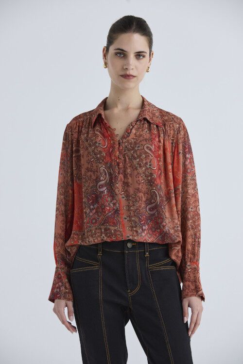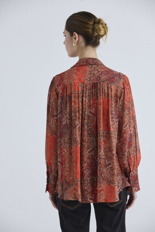The Layla Shirt is a lightweight viscose georgette piece featuring a modern patchwork paisley print. It showcases a collared neckline adorned with self-covered buttons secured by rouleau loops. Soft gathers at the front yoke and overarm create a dreamy, floaty silhouette. 100% viscose