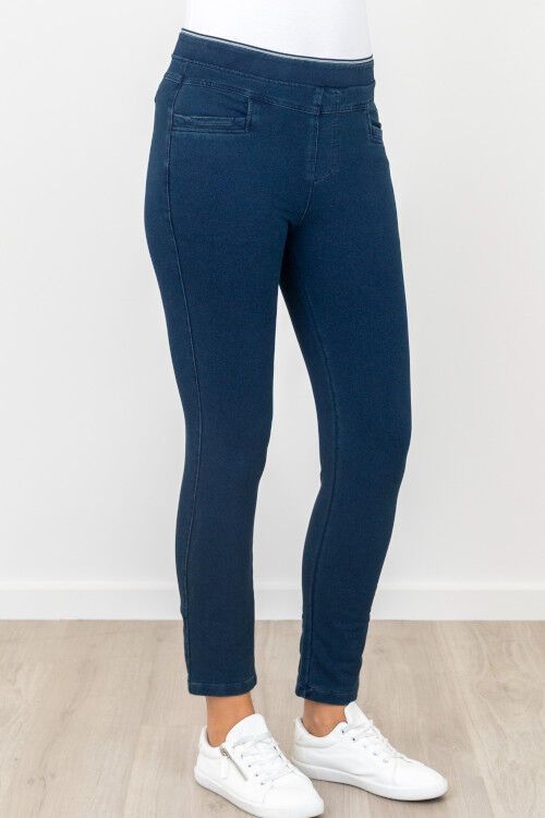 Stretchy full length denim pull on pant. Cotton/polyester/spandex