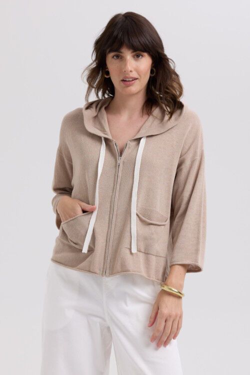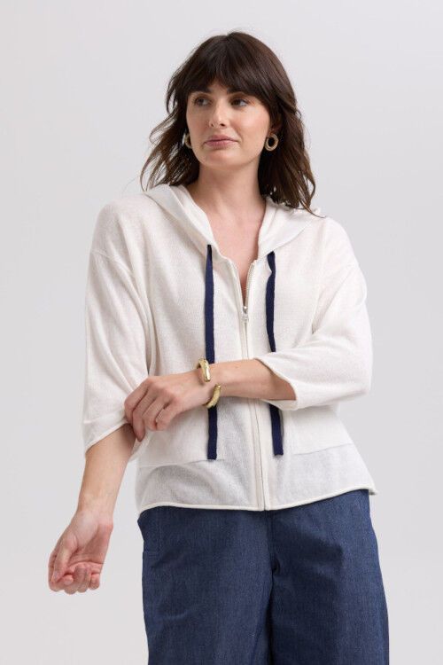 A summer lightweight hooodie with drop shoulder line, rolled edge on cuff, pocket and hemline and contrast drawstring. 55% linen, 45% cotton
