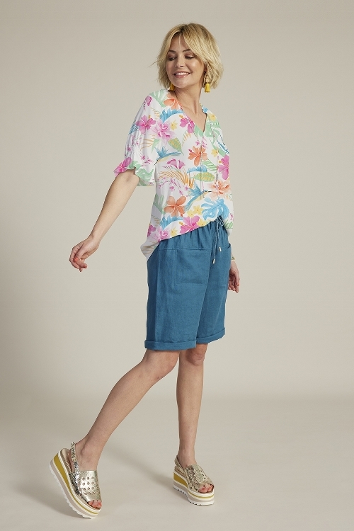 Linen shorts with pull-on elasticated waistband. Featuring adjustable drawstring with metallic tie ends and functional front pockets with flap detailing. 100% linen