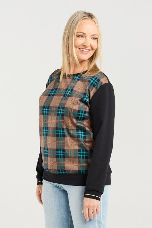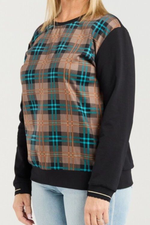 This long-sleeve top features a round neckline with a contrasting plaid bodice for a modern, stylish touch. Elasticated arm cuffs are finished with subtle striped trim, combining comfort with a refined, contemporary look perfect for winter layering. 97% cotton, 3% spandex