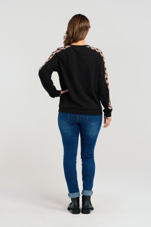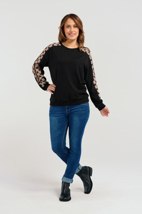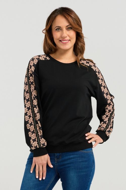 This long-sleeve top features a standard fit, offering a comfortable and flattering shape for everyday wear. The classic black color provides a sleek and versatile base, while the basket weave print contrast fabric on the sleeves and trim adds a unique texture and stylish detail. The combination of smooth black fabric with the woven pattern on the sleeves and edges creates a modern, elevated look, perfect for both casual and slightly dressier occasions. Simple yet distinctive, this top is a wardrobe essential that effortlessly blends style and comfort. 95% cotton, 5% spandex