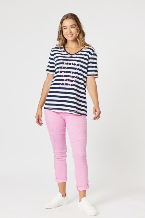 • Featuring bold blue and natural stripes, this playful tee is accented with vibrant orange “XO XO” embroidery across the front for a pop of personality.
