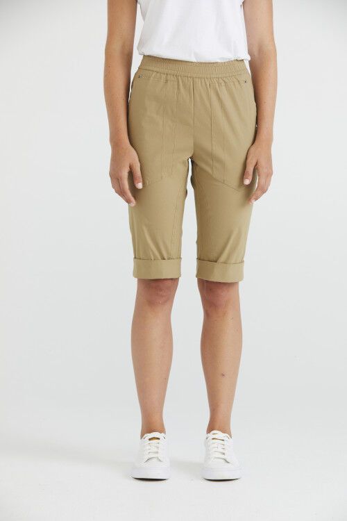 Relaxed knee length short with optional turn up cuff, features elasticated waist in lightweight cotton rich stretch fabric. 69% cotton, 27% nylon, 4% elastane