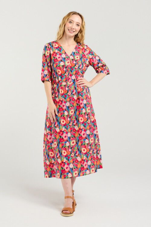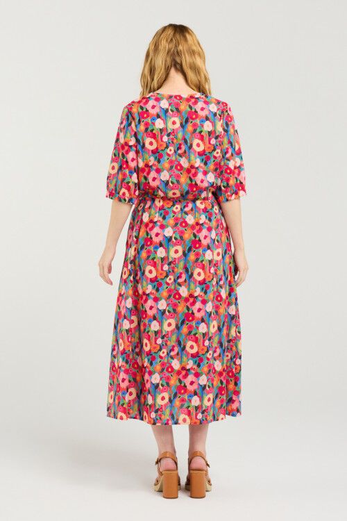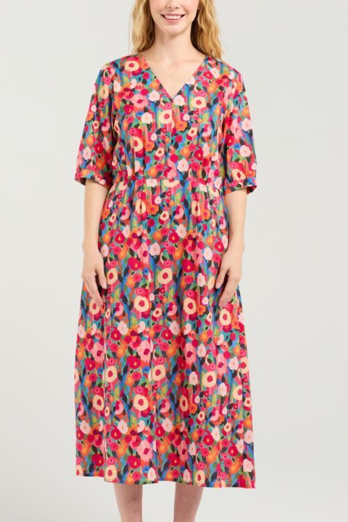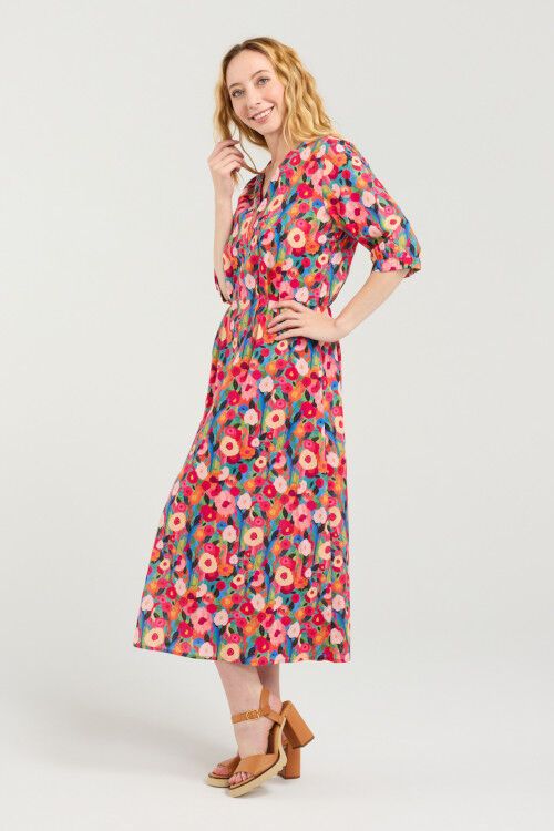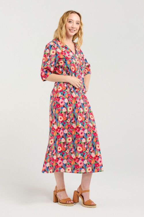 This V-neck dress bursts with a colorful floral print that radiates joy and energy. The short sleeves and easy silhouette make it a go-to for warm-weather days. 100% cotton