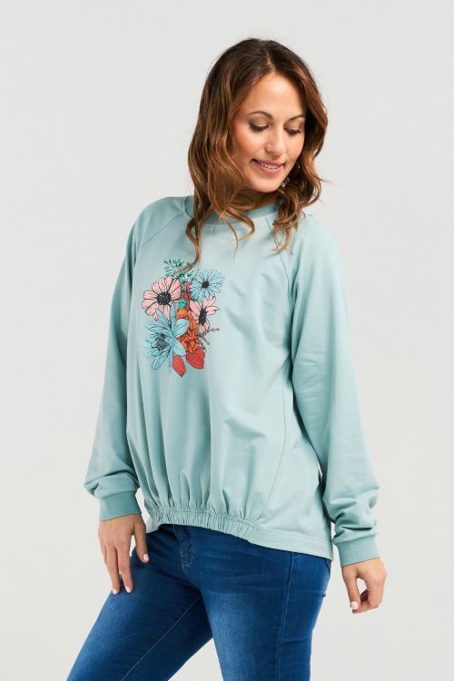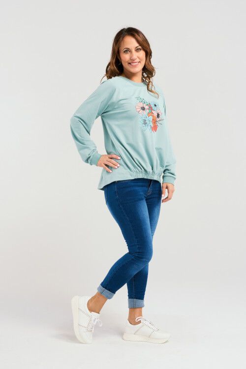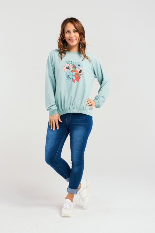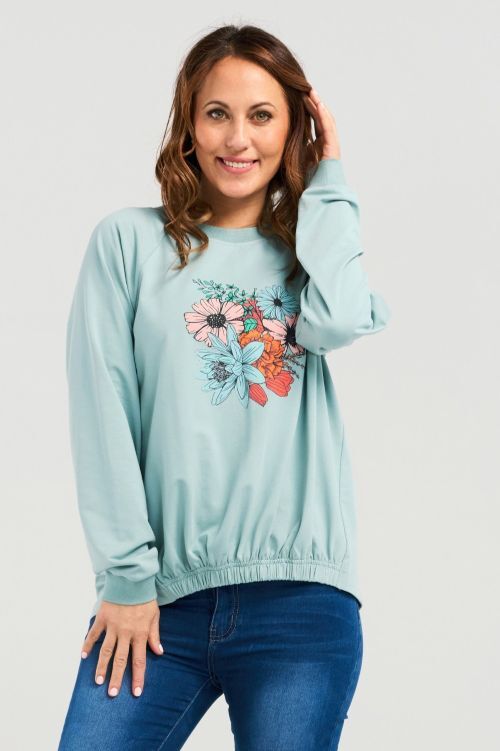 This top offers a relaxed fit and a slight high-low hemline for a flattering silhouette and effortless wearability. The elasticated hem adds a subtle shape while enhancing ease of movement. A playful floral print on the front brings a vibrant, cheerful vibe, making it a perfect piece for casual days with a dash of charm. 95% cotton, 5% spandex