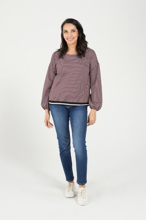 Cotton blend top. Micro gingham, waist band trim. 53% cotton, 47% Sorona