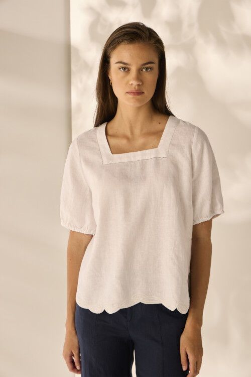 A delicate lace embroidery mirroring the square neckline creating a feminine vibe on the Marlo Top. A soft embroidery design along hemline balance out the elasticated sleeves. Pair with any linen bottoms or jeans for an elevated look.  100% linen