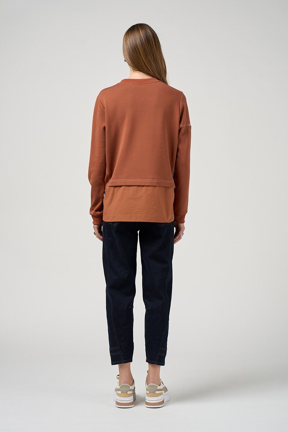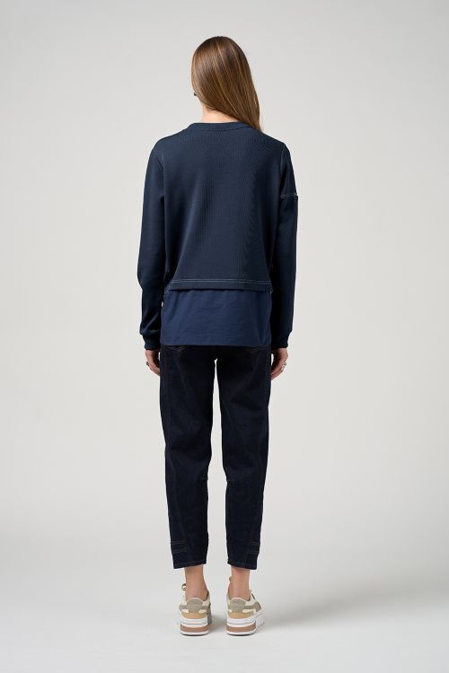 Crew neck sweatshirt with ribbed detail on the neckband and cuffs, and a poplin tailed hem panel. Featuring contrast topstitching,with rivet detailing and a pocket on one sleeve.  78% Cotton, 18% Polyester, 4% Spandex