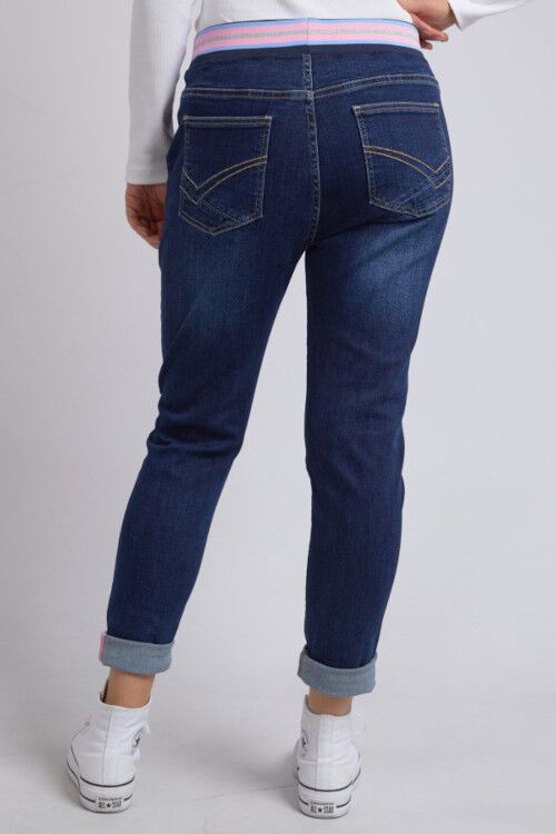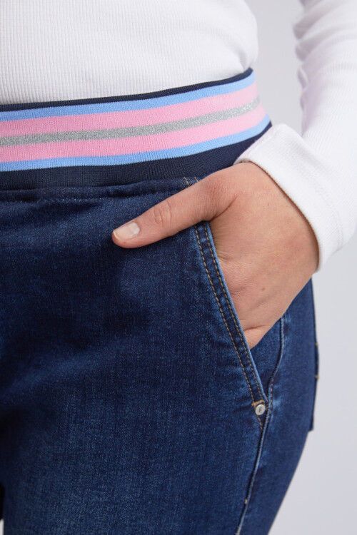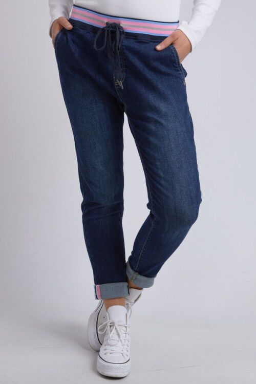 The Melody Denim Jogger is a functional and fantastic stretch pant featuring a slim leg and comfort plus rib waist band with a cute metallic stripe. Stretch denim