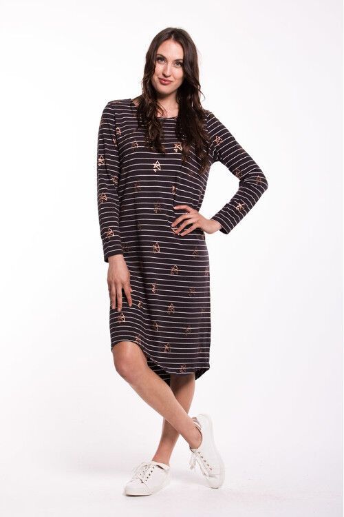Tee shirt dress with long sleeves, asymmetrical hem and trendy stripe & gold graphic print. 95% cotton, 5% spandex