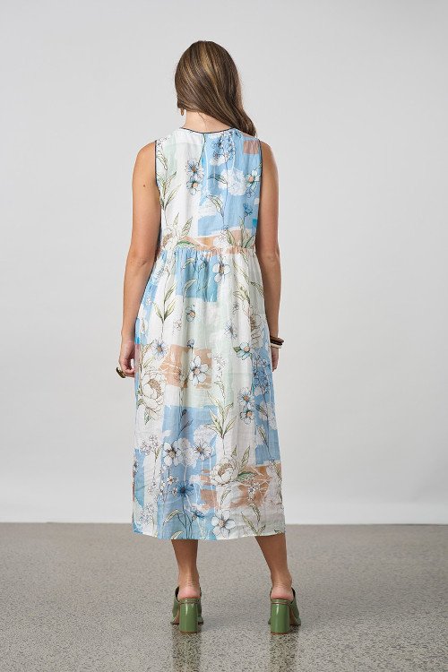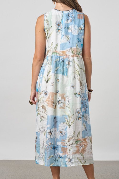 Printed V neck dress with bust darts and waist seam for a perfect fit. Featuring a gathered skirt for ease. Lined. 100% ramie (lining 100% rayon).