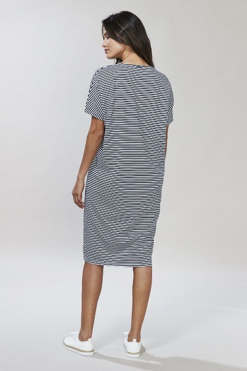 Drop shoulder jersey knit dress with placement print. Side seam channels at the hem to ruch and create a higher hem. 95% cotton, 5% elastane