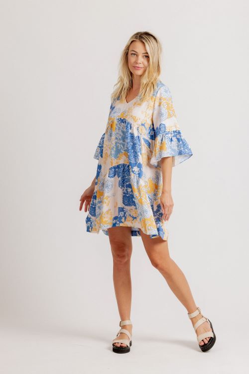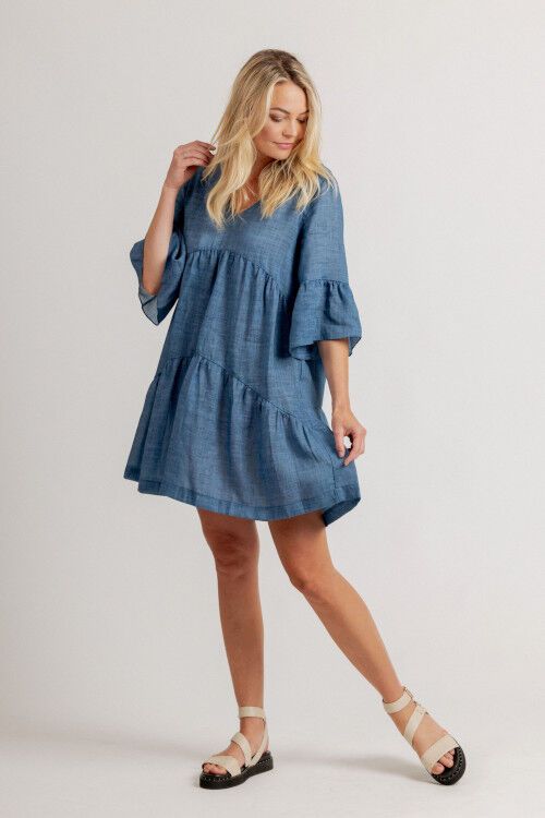 A gorgeous summer print fabric. Shorter length dress wth V neck, tiers and deep frilled sleeves. 60% linen, 40% tencel