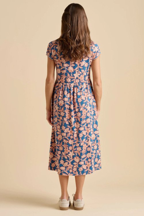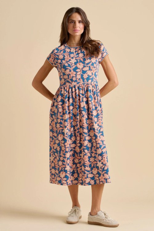 Midi-length relaxed fit dress with capped sleeves, comfortable crew neckline and gently gathered waistline. 100% cotton
