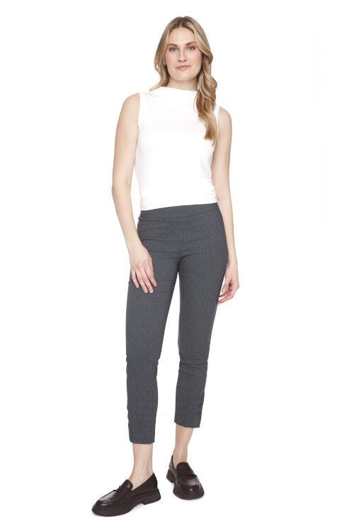 Ankle length Techno pant with side ankle slit. Slip-on wide elastic waistbandwith built-in tummy control. slim fit and mid rise. Designed in Canada. 46% viscose, 36% polyester, 14% nylon, 4% elastane