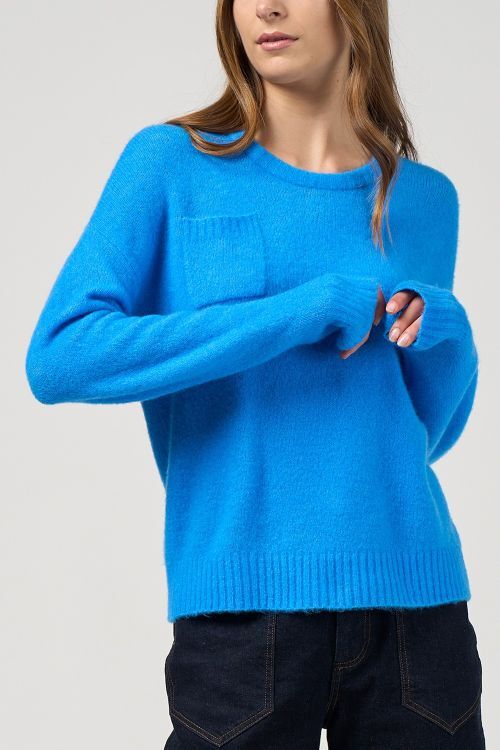 Crew neck sweater in a soft fluffy knit, with a dropped shoulder and a contrast faux pocket detail on the front.  25% Wool 45% Acrylic 28% Polyamide 2% Elastane